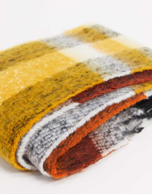 Asos Design Long Fluffy Blown Up Check Scarf In Mustard And Brown Check Asos